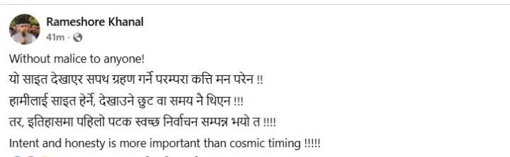 भावी प्रधानमन्त्री बालेन शाहले शुक्रबार दिउँसो १२ः३४ बजे शपथ लिने साइत तय भएको समाचार सार्वजनिक भएपछि खनालले यस्तो प्रतिक्रिया दिएका हुन् ।